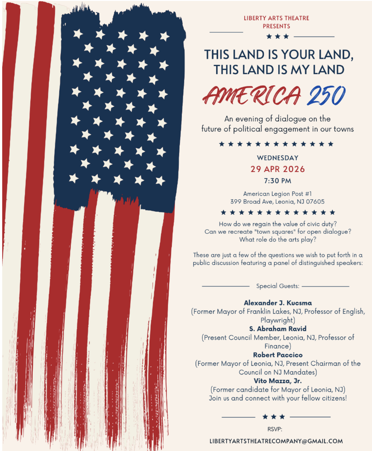 AMERICA 250This Land Is Your Land,This Land Is My LandAn evening of dialogue on thefuture of political engagement in our townsHow do we regain the value of civic duty?Can we recreate “town squares” for open dialogue?What role do the arts play?These are just a few of the questions we wish to put forth in a public discussion featuring a panel of distinguished speakers:Alexander J. Kucsma (Former Mayor of Franklin Lakes, NJ, Professor of English, Playwright)